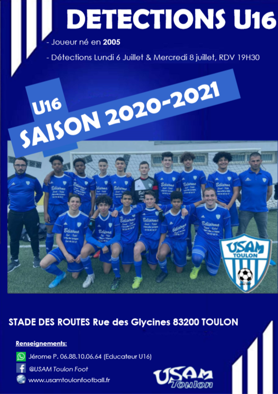 En vue de la saison 2020-2021, détection Lundi 6 juillet et Mercredi 8 Juillet 19H30 au Stade des Routes. Concerne les joueurs nés en 2005.