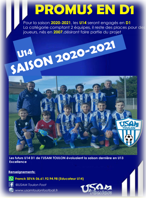 Pour la saison 2020-2021, les U14 seront engagés en D1. La catégorie comptant 2 équipes, il reste des places pour des joueurs, nés en 2007, désirant faire parti du projet .
