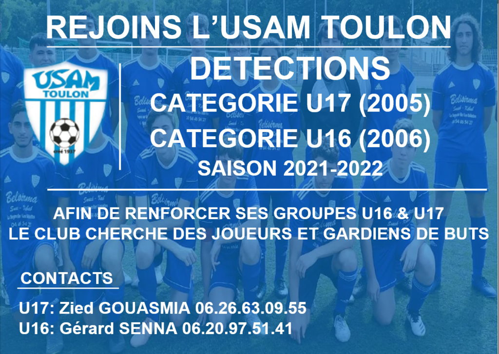 Afin de renforcer ces effectifs en football à 11 catégories U16 & U17, l'USAM TOULON cherchent des joueurs & gardiens de buts.